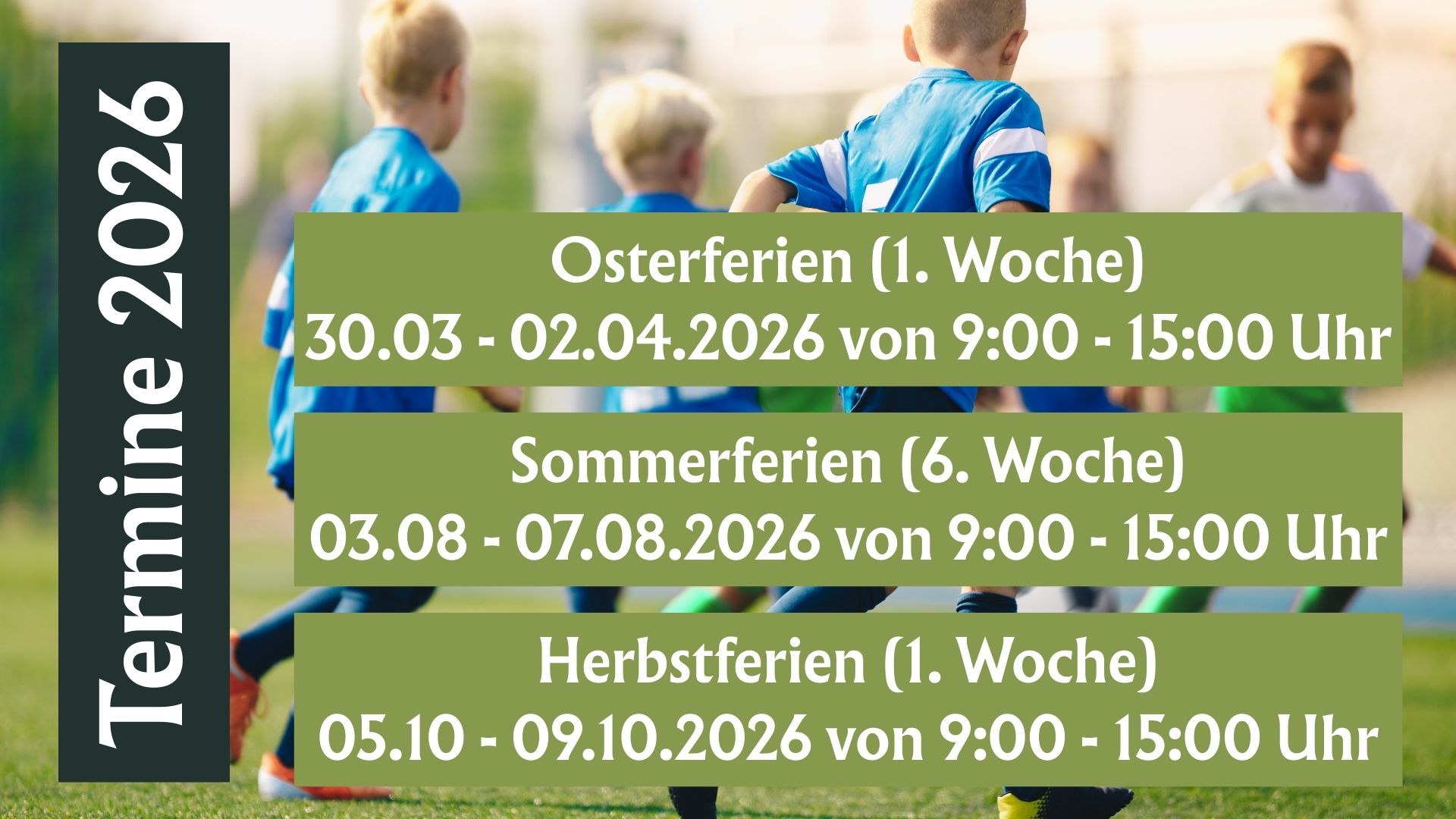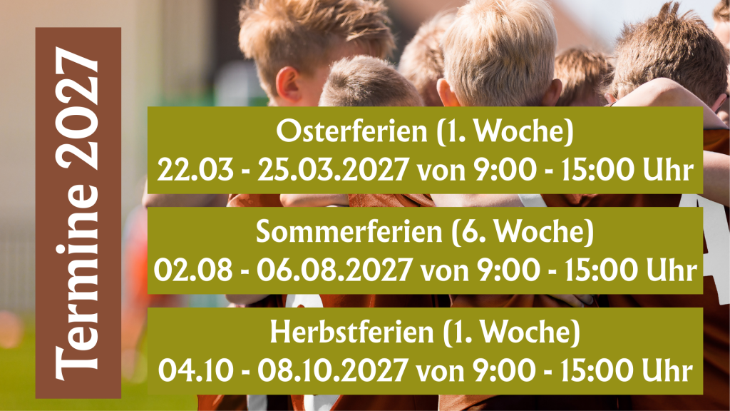 Highlight FERIENCAMP- Deine Krankenkasse zahlt! Ort: Sportplatz Alten-Buseck Preis für vier Tage Feriencamp Feriencampkosten erstatten lassen Zweimal im Jahr können die Kosten bis zu 100% von den gesetzlichen Krankenkassen erstattet werden. Mehr Informationen Inhalte des Feriencamps Für Kinder im Alter von 6 – 14 JahrenBeginn um 9 Uhr – Ende um 15 UhrMindestens 2 Fußball-Trainingseinheiten (90min) pro TagTägliches Mittagessen, Getränke und SnacksQualifizierte Trainer (Lizenzen für alle Camp-Inhalte)Gruppengröße von 8 – 16 Kinder pro TrainerFrüh- und Spätbetreuung von 8:00 – 15:30 Uhr möglich (auf Nachfrage)Rabattaktion JSG-B/R: Mitglied bei JSG Buseck/ Rödgen (-15€)Rabattaktion EarlyBird: Buchung 2 Monate vor Camp-Start (-15€)Willkommensgeschenk bei der ersten Teilnahme Gratis Trikot von Puma (auf Wunsch mit Name und Nummer)Abschlussgrillen mit den Eltern am Freitag (von 12:00 – 13:00 Uhr) Henning Löhmer Erfahrungen Fußballtrainer im Jugendbereich:A-JugendC-JugendD-JugendD-Jugend (Mädchen)Leitung von Feriencamps:Football Academy Germany (Dortmund)Örtliche Fußballschule (Wuppertal)Highlight FERIENCAMP (Gießen)Aktiver Spieler der SGTAB Kooperationspartner und Sponsoren Anmeldung Bitte aktiviere JavaScript in deinem Browser, um dieses Formular fertigzustellen.Feriencamp *2026 - Ostercamp (30. März - 02. April)2026 - Sommercamp (03.-07. August)2026 - Herbstcamp (05.-10. Oktober)Mein(e) *SohnTochterKindName *VornameNachnameGeburtsdatum *01.01.2017Straße und Hausnummer *Postleitzahl und Wohnort *E-Mail *Telefonnummer *NotfallnummerVereinPosition *Torhüter(in)Feldspieler(in)Trikot-Größe *116128140152164SMWir empfehlen die nächstmögliche Größe zu wählenExtra-Druck auf das Trikot *ohne (kostenlos)Name und Nummer (+10€)Spitzname möglich (bei Bemerkungen angeben)Spitzname und Nummer (Extra-Druck fürs Trikot)Krankenkasse *Essgewohnheiten *FleischFischHalalVegetarischVeganAllergien/MedikamenteWissenswertes (Herzerkrankungen, Cochlea-Implantat, ADHS, etc.)Feriencampgebühr (verbindliche Anmeldung nach Eingang der Kursgebühr) *Ostern: Normales Ticket: 165€Ostern: JSG Buseck/Trohe: 150€ (Nachweis der Vereinsmitgliedschaft)Ostern: Early Bird: 150€ (mindestens 2 Monate vor Campbeginn)Sommer: Normales Ticket: 195€Sommer: JSG Buseck/Trohe: 180€ (Nachweis der Vereinsmitgliedschaft)Sommer: Early Bird: 180€ (mindestens 2 Monate vor Campbeginn)Herbst: Normales Ticket: 195€Herbst: JSG Buseck/Trohe: 180€ (Nachweis der Vereinsmitgliedschaft)Herbst: Early Bird: 180€ (mindestens 2 Monate vor Campbeginn)Bank N26, Kontoinhaber Henning Löhmer, IBAN: DE86 1001 1001 2419 8573 63, BIC NTSBDEB1XXX. Die Rechnung kommt per Mail. Da dies händisch gemacht wird, kann es zwischen 24 - 72h dauern. Datenschutzbedingungen *Ich willige ein, dass diese Website meine übermittelten Informationen speichert, sodass meine Anfrage beantwortet werden kann.Verbindliche Anmeldung *Mit Absenden des Formulars melde ich mein Kind, verbindlich und mit Akzeptanz der Teilnahmebedingungen, an der oben genannten Veranstaltung, an.Absenden