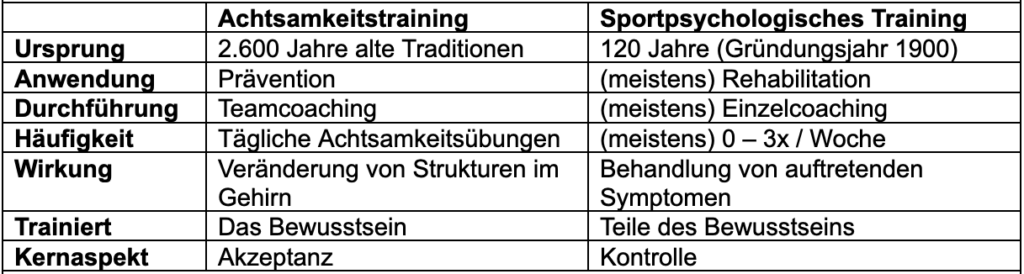 „Vergleicht man Achtsamkeitstraining mit gängigem Mentaltraining, so könnte man subsumieren, dass Mentaltraining Aspekte des Geistes trainiert, Achtsamkeit aber das Bewusstsein selbst. Es stellt gleichsam ein Grundlagentraining der Psyche dar, um darauf aufbauend optimale Leistung zu entfalten. Letztlich kann auch der talentierteste Athlet nur die Leistung abrufen, die von der Psyche freigegeben wird“